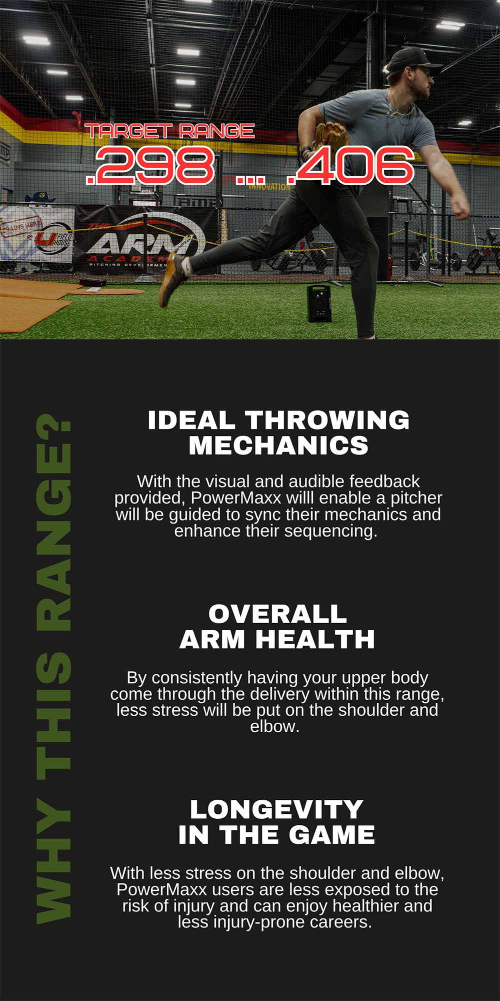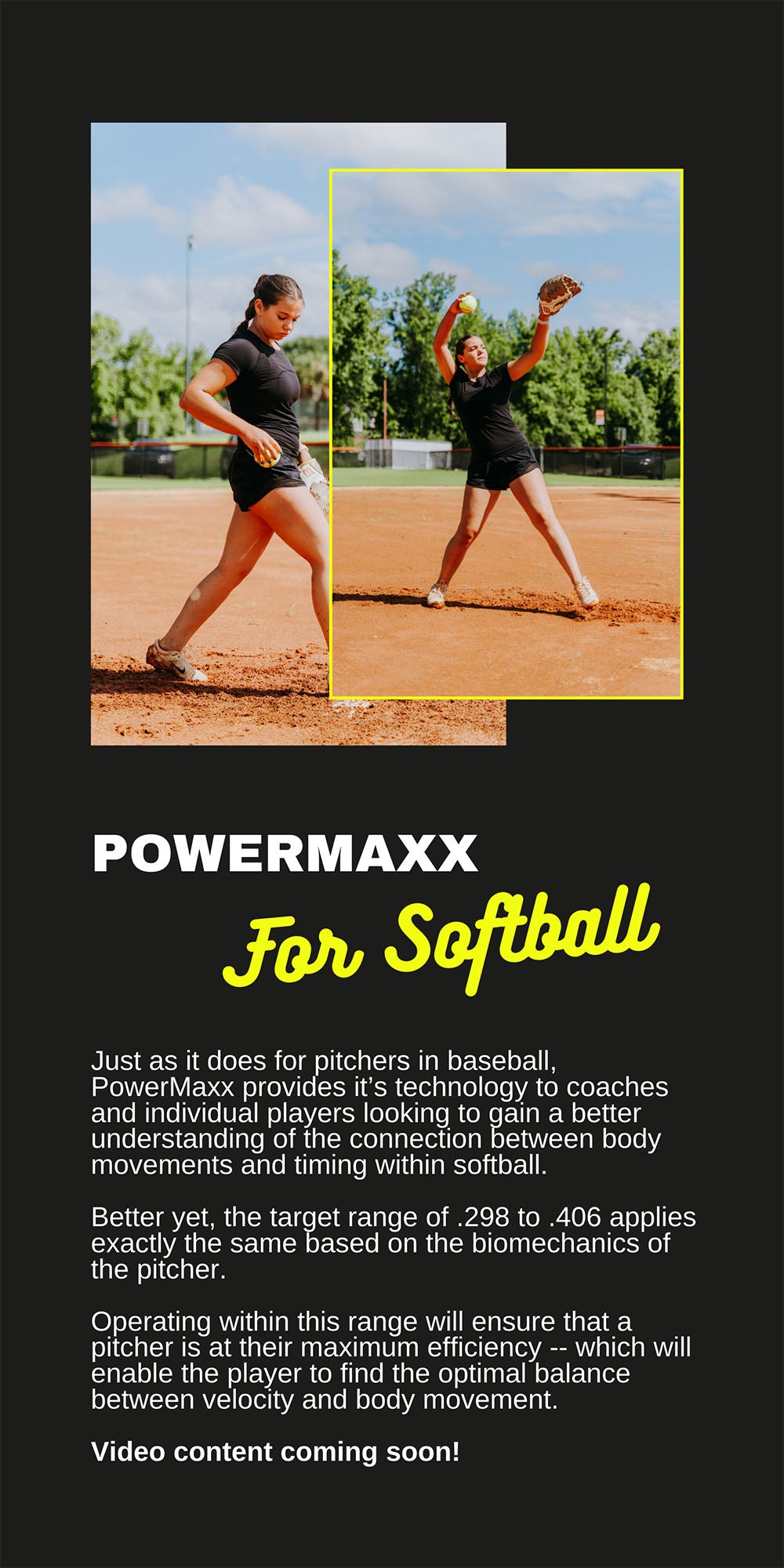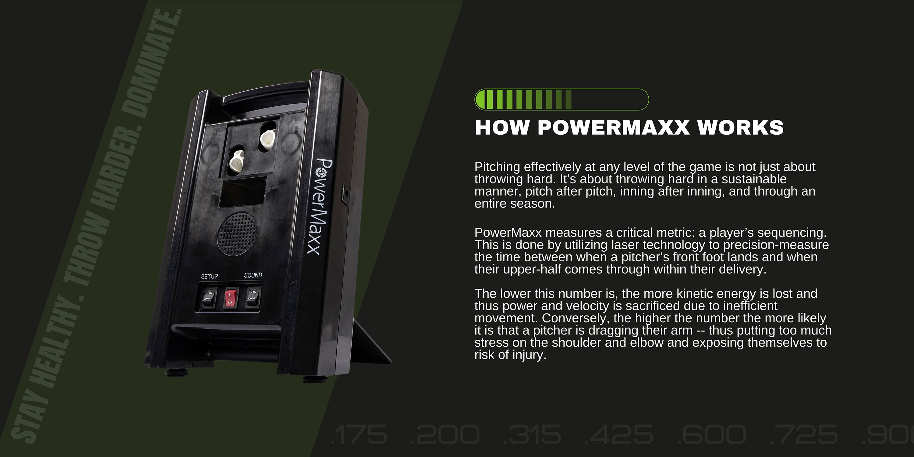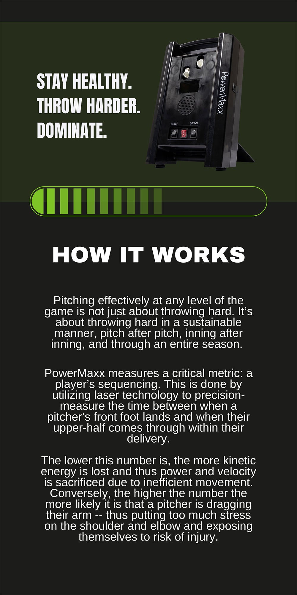 "PowerMaxx provides a cost-effective way for pitchers to receive real time data about their delivery and mechanical sequencing. The portability of the device is excellent, and the setup/configuration time is very minimal. Pitchers of all ages can benefit from the feedback that the PowerMaxx provides."